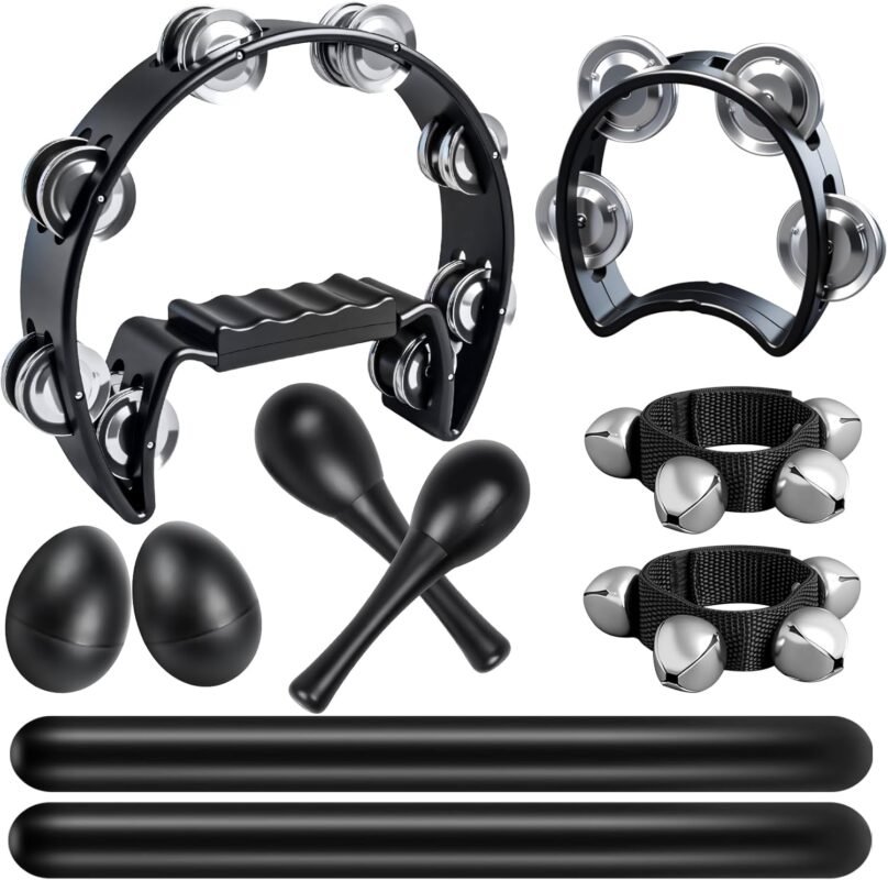 10 Pcs Black Tambourines for Adults – Half Moon Tambourine, Wood Rhythm Sticks, Bells Tambourine, Wrist Bells, Egg Shakers, a Pair Maracas, Musical Percussion Instrument Set for Church,Party