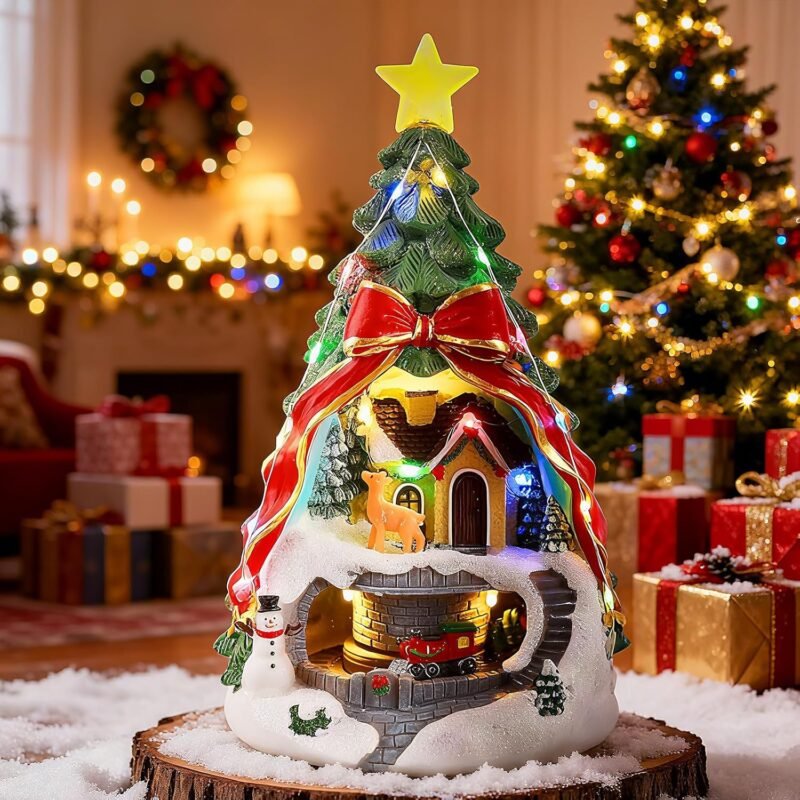 10.24in-Christmas Music Box,Featuring a Rotating Train、Village House and Multi-Colored Lights as Christmas Decorations-Battery & USB -Plays 8 Holiday Carols. Christmas Decorative Gifts
