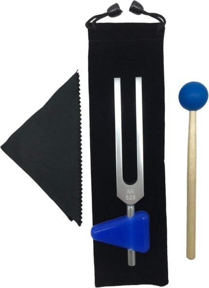 528 Hz Tuning Fork for Healing, DNA Repair, Reliever Stress and Perfect Musical Instrument, Frequency of Love, Silver, with Black Rubber Mallet, Triangular Silicone and Velvet Storage Bag