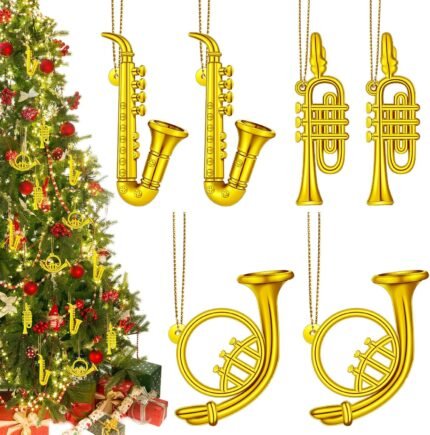 6 Pieces Musical Instruments Ornaments Christmas Decoration Gold Saxophone Horn Trumpet with Gold Ropes Brass for Christmas Tree Decor