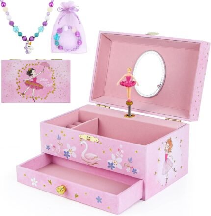 Music Jewellery Box with Drawer Necklace Bracelet, Musical Jewelry Storage Case with Spinning Ballerina Gift Set for Kids Girls Children Daughter (Pink Ballerina)