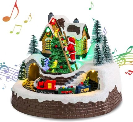 Bshine Christmas Village House, Santa Claus and Rotatable Train Christmas Ornaments 7×8.6 Inch Musical with LED Lights Collectible Building for Christmas Indoor Home Desktop Decoration