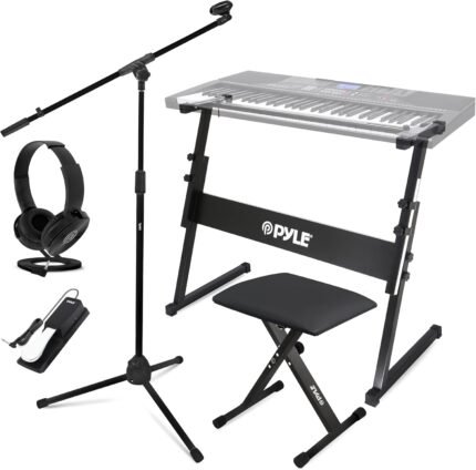 PYLE Heavy-Duty Electric Keyboard Accessories, E Piano Equipment Pack Includes Height Adjustable Z Shape Keyboard Stand, Keyboard Stool, Microphone Stand, Headset, and Sustain Pedal, Black