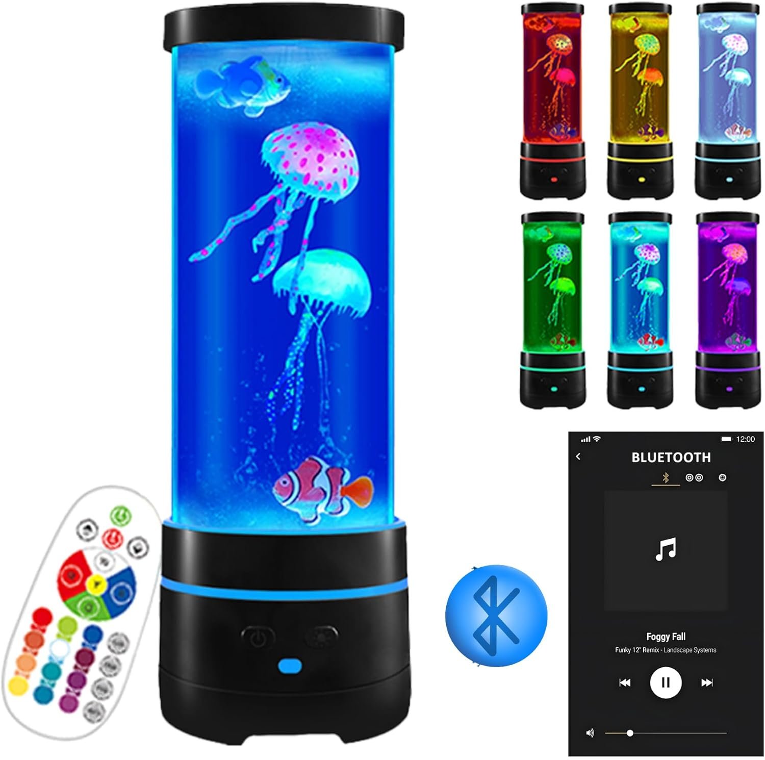 15″ Jellyfish Light with Bluetooth Speaker,Black Modern Cylindrical Aquarium with 4 Jellyfish (2 Large + 2 Small), 16-Color Remote Control LED Lights,USB Powered,For Home and Office Decoration