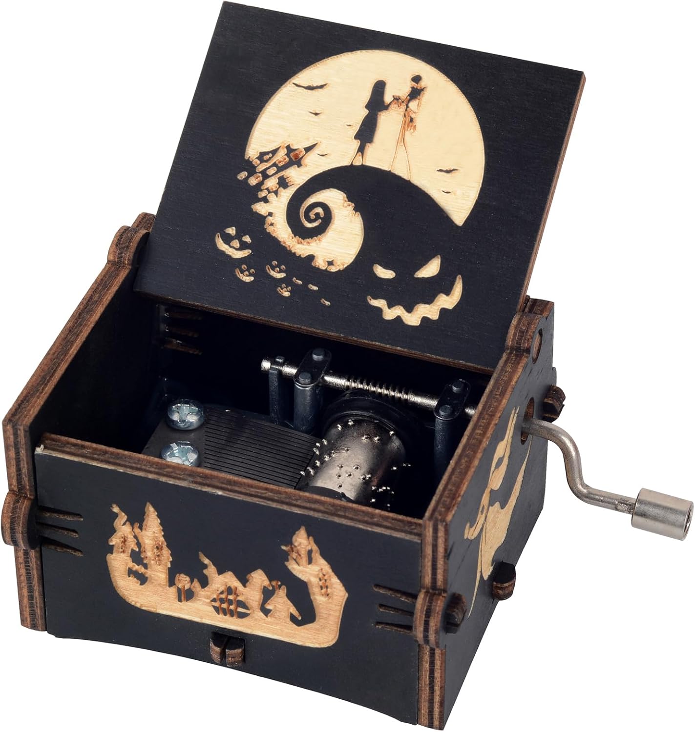 Music Box Cute Hand-Crank Musical Box This is Halloween Melody Gifts for Halloween Christmas Valentines Day Birthday Home Decor Wooden Black
