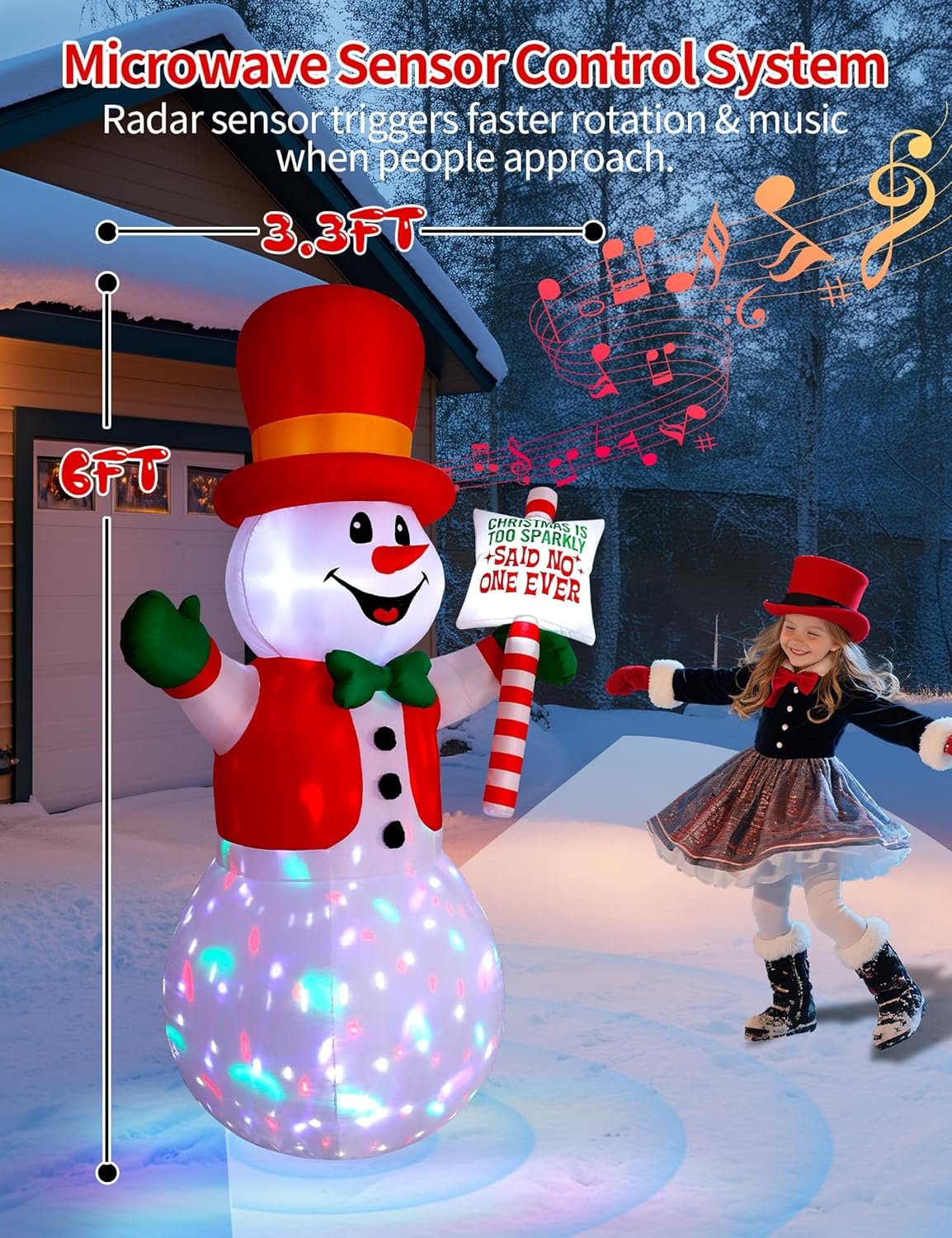 6 FT Christmas Inflatable Snowman with Motion-Activated Christmas Greeting Music & Spinning Light, Blow Up Gentleman Snowman Outdoor Inflatable Decoration for Holiday Yard Lawn Patio
