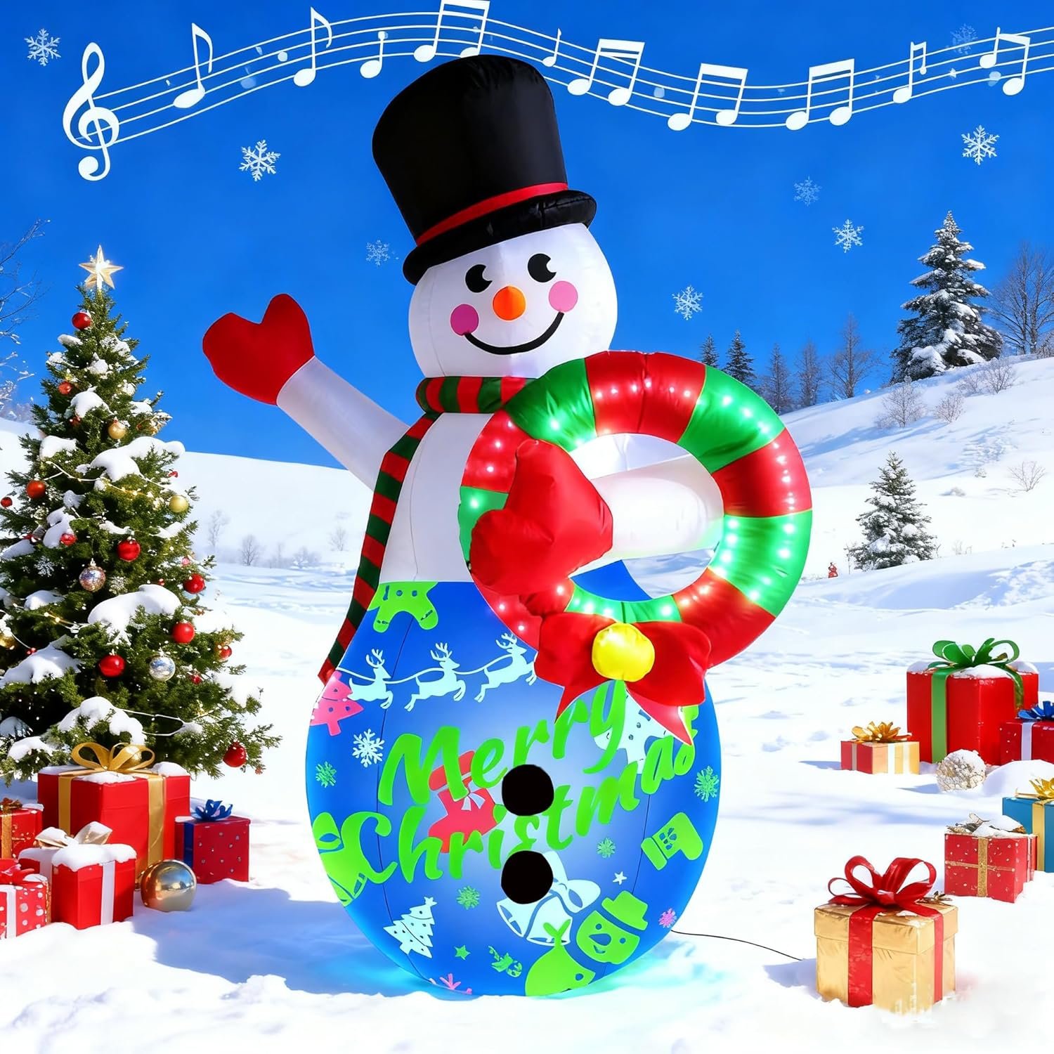 8FT Christmas Inflatables Snowman Built-in Colour Projection LED Lights with Music,Festive Party New Year Patio Outdoor Christmas Decoration (Wreath Snowman)