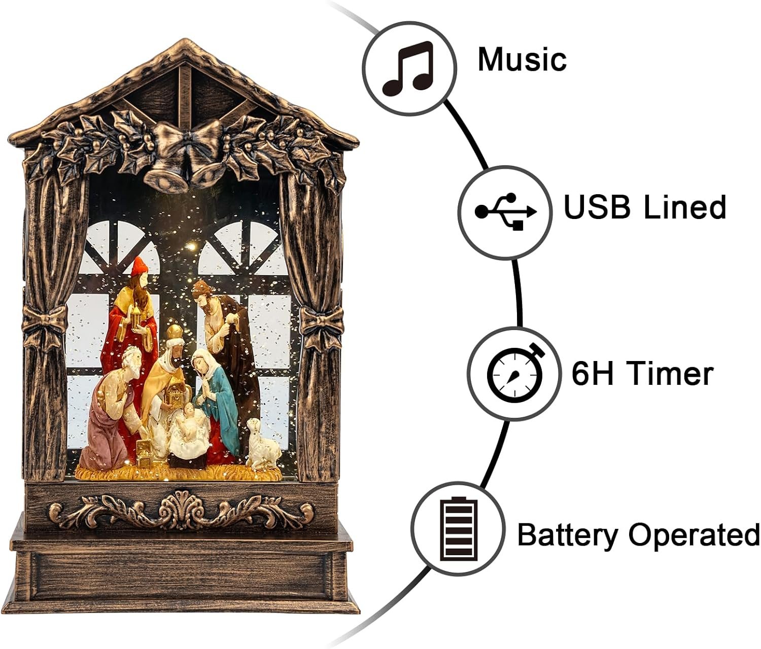 Christmas Snow Globe Lighted Manger Nativity Scene, Musical Window Water Lantern Play Silent Night Music in Swirling Glitter, Holiday Decorations Gift