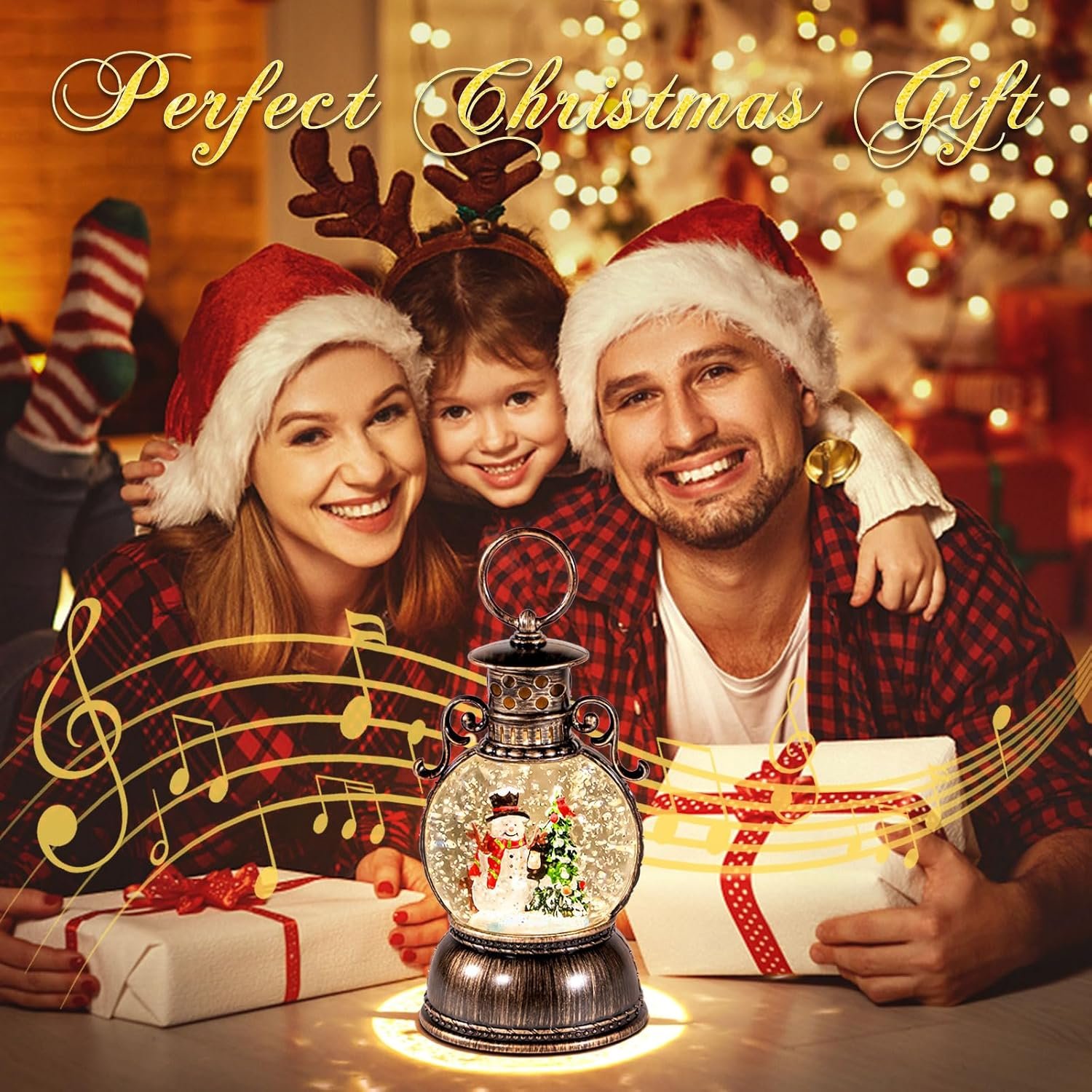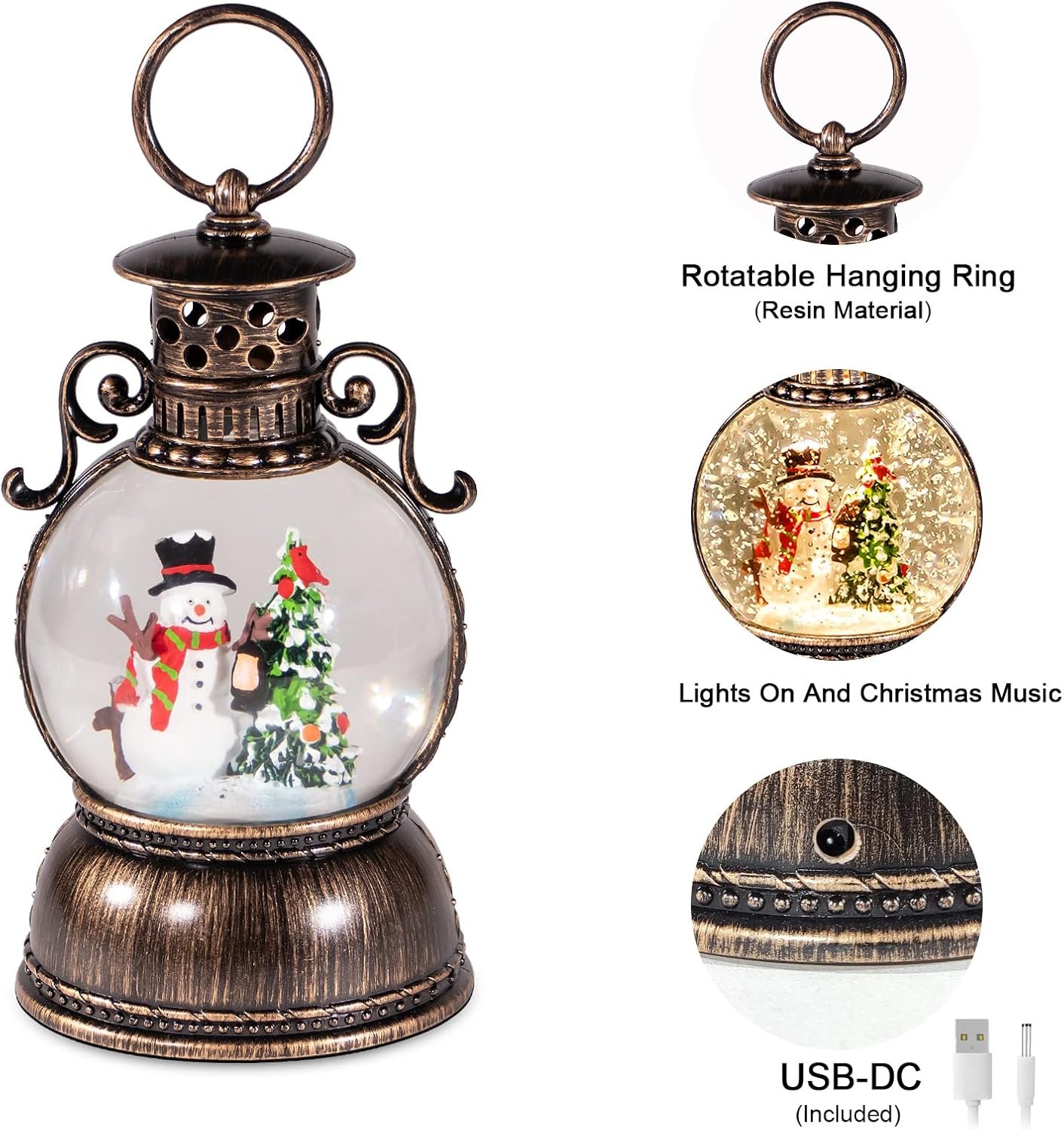 Christmas Snow Globes Lantern Musical,6H Timer Cylinder Glitter Snow Globe,Bronze Snow Globes Christmas with Music Box Including 8 Songs,Lantern with Xmas Tree Snowman Decor