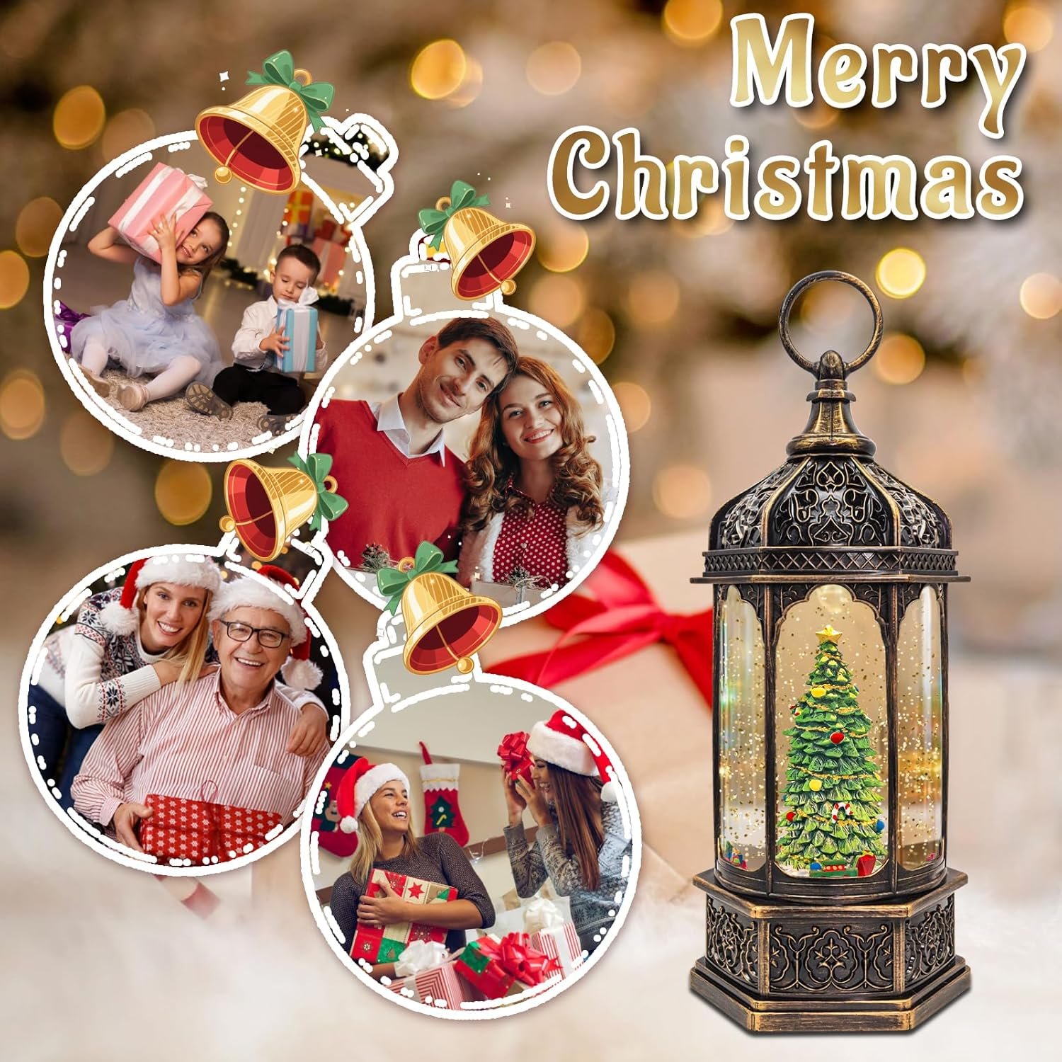 Christmas Snow Globes with Music,6H Timer Cylindrical Flashing Snow Ball,Bronze Musical Box Including 8 Songs,Glitter Snowflakes Lantern with Christmas Tree Xmas Decor Gift