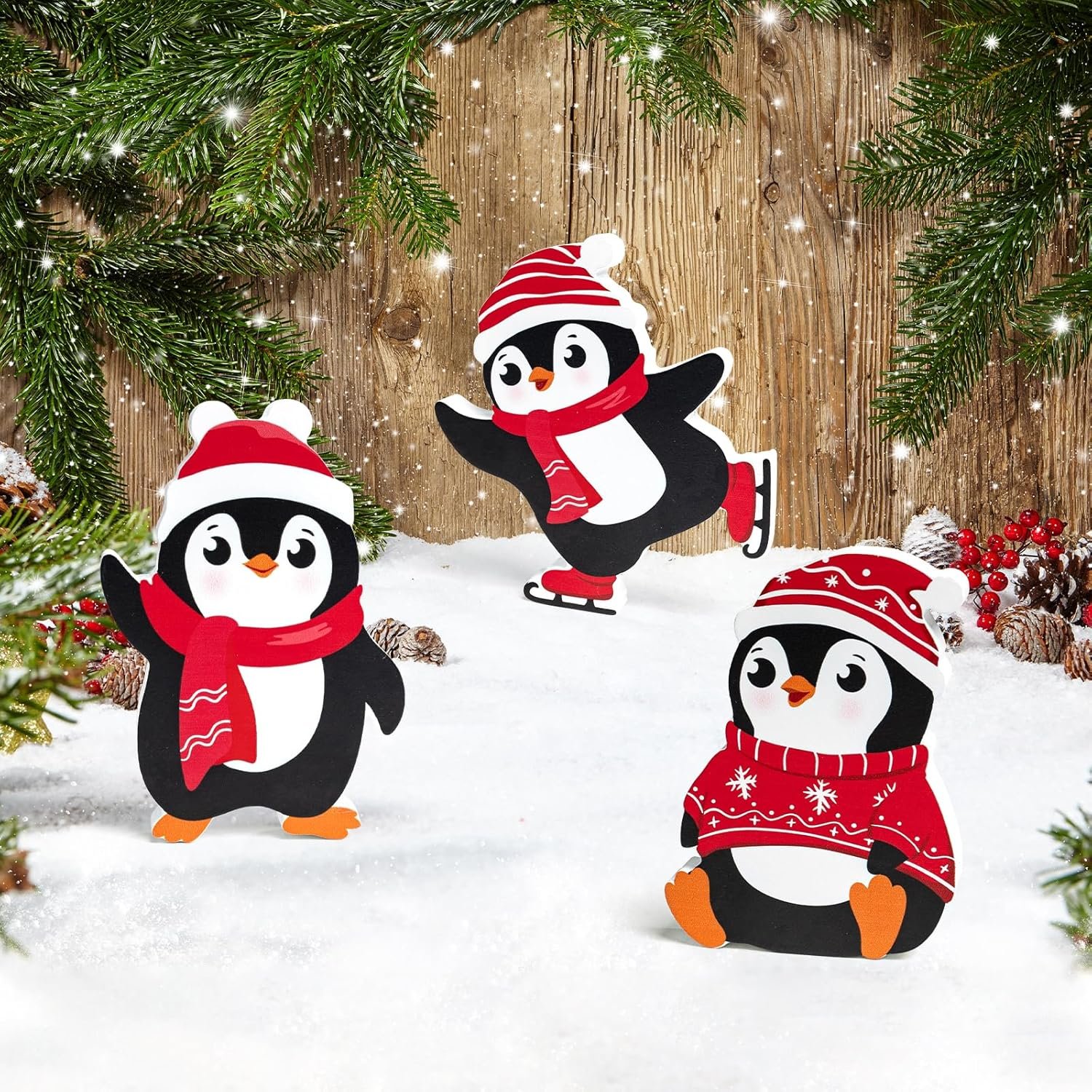 COCHIE Penguin Christmas Decorations Indoor, Cute Penguins Winter Tiered Tray Decor Set of 3, Wooden Penguin Blocks Xmas Table Decoration for Party Home Office Shelf Door (Red)