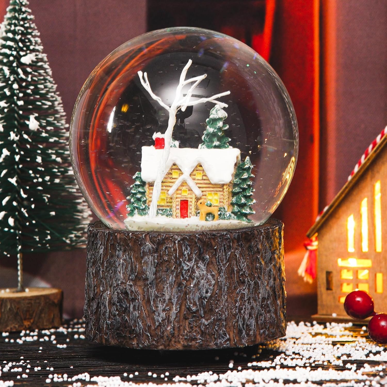 DUSVALLY Snow Globe with Music, Christmas Decorations for Home, Glitter Spinning Glass Water Globe with Cabin in The Snow, for Kids and Women