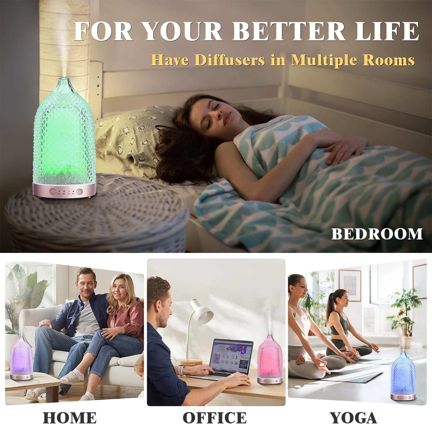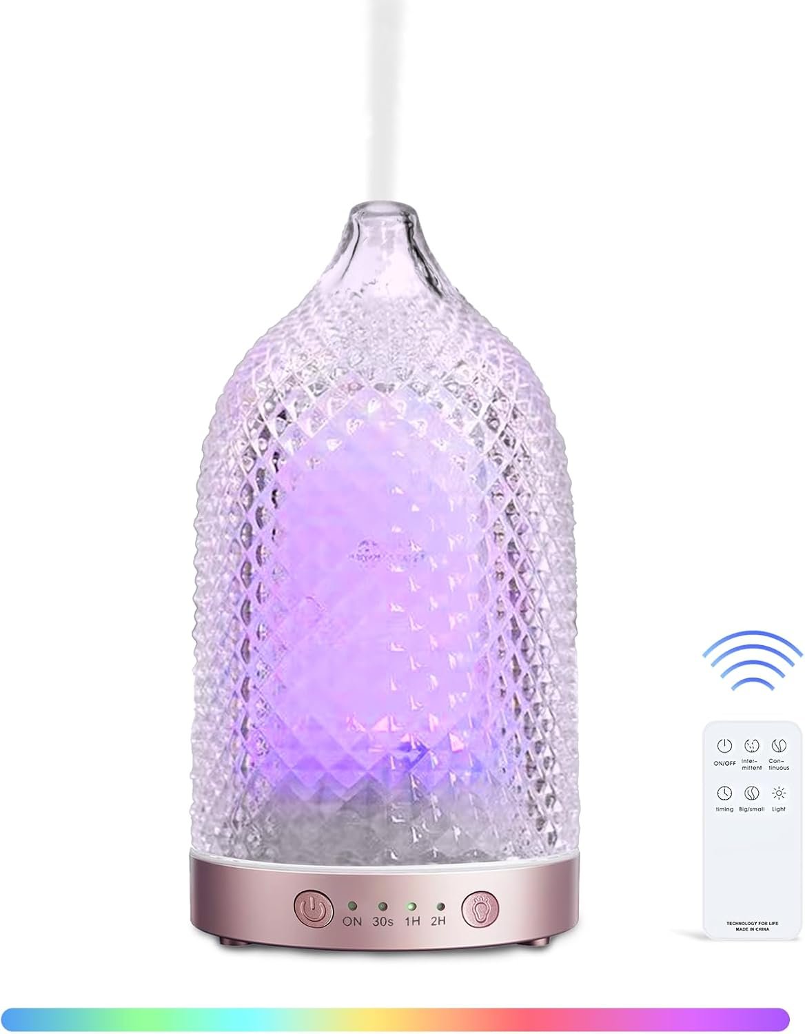 Glass Essential Oil Diffuser, 7 Colors Glass Diffusers for Essential Oils with 2 Mists Remote Control Auto-Off Timer, 200ML Aromatherapy Diffuser for Home Office Bedroom (Rose Gold)