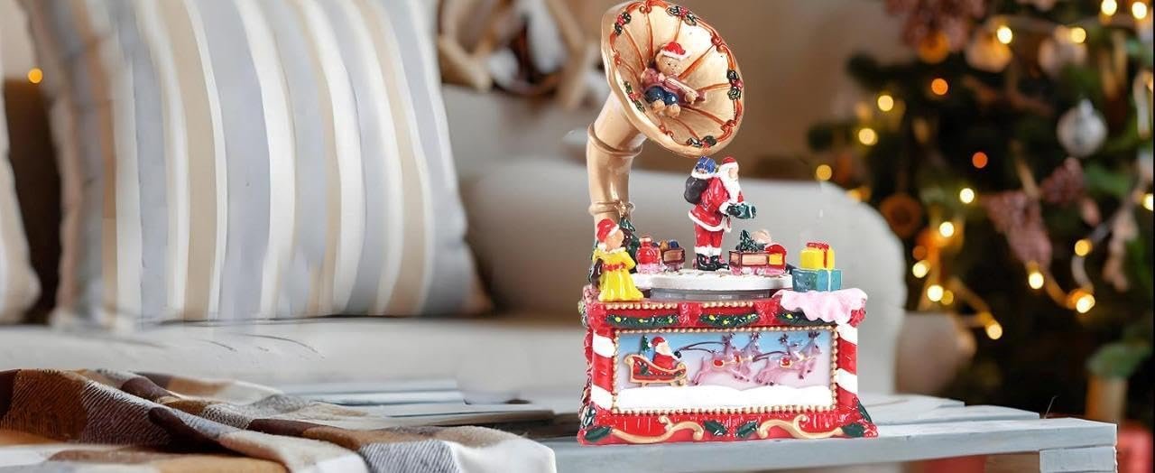 Lightahead Christmas Musical Gramophone – Rotating Santa, Bears & Train Figurines – Festive Polyresin Music Box with Seasonal Melodies