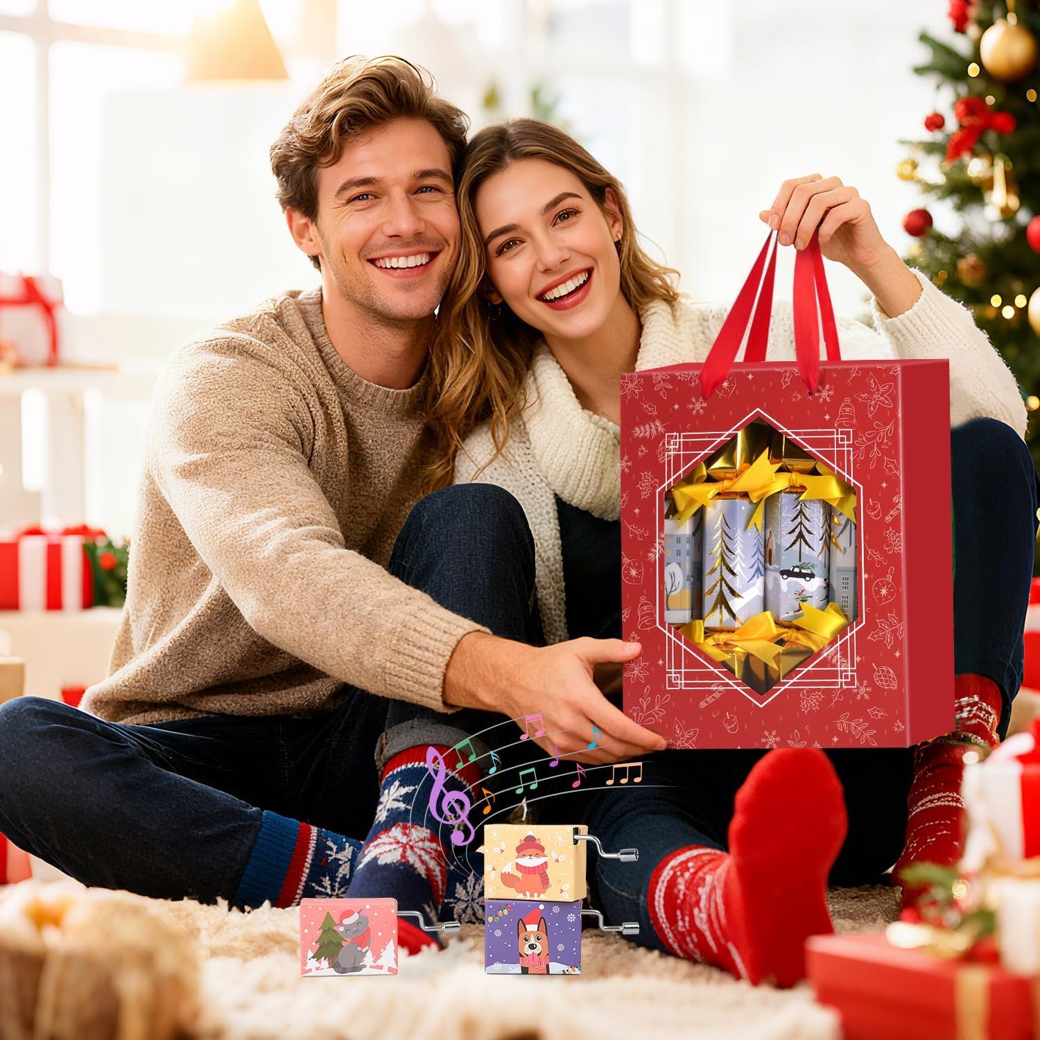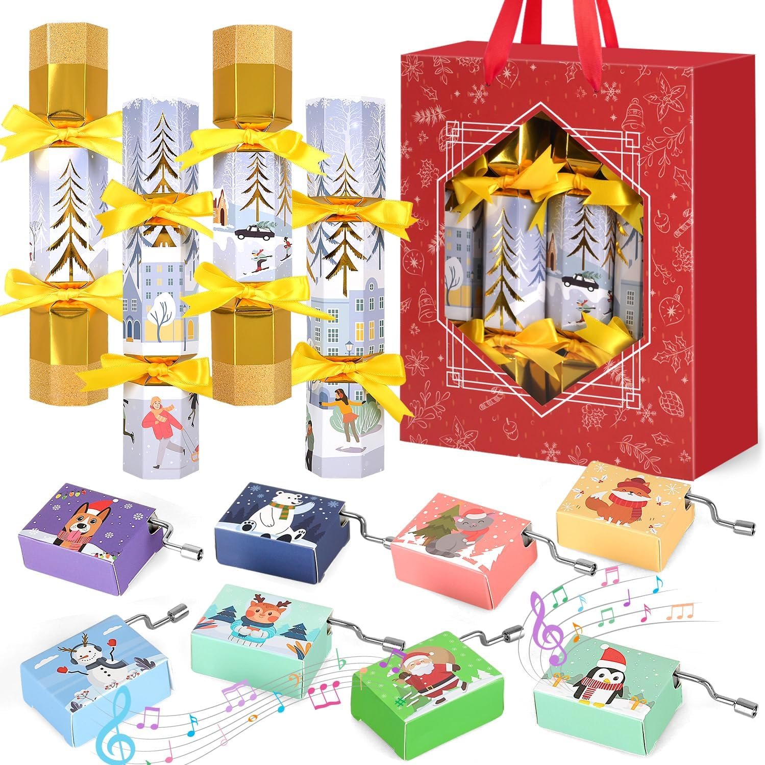 MOVINPE 8 Pack Christmas No Snap Party Table Favors, 10” Christmas Table Decorations with Hand-Crank Music Boxs, Paper Crown, Joke Card, Traditions Holiday Family Dinner Gift
