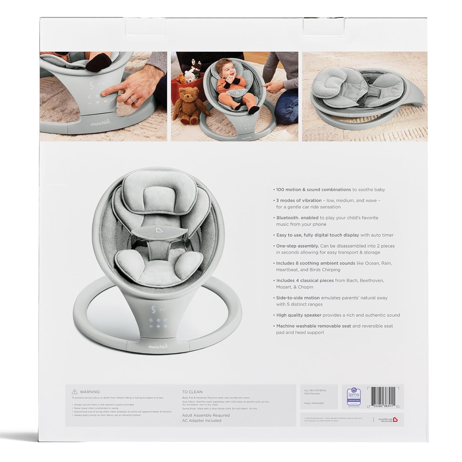 Munchkin Electric Baby Swing with Vibration – Portable Swing for Newborn and Infant, Bluetooth-Enabled Smart Seat with Music, Motion, and Sounds, Light Grey