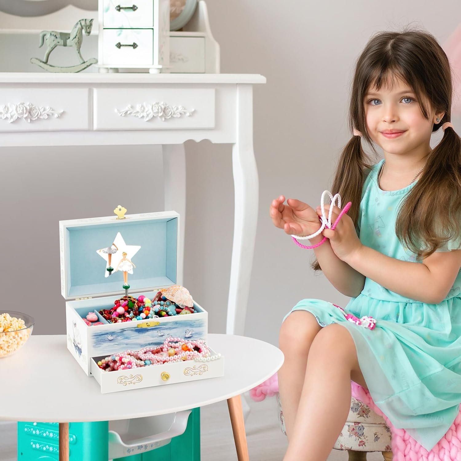RR ROUND RICH DESIGN Kids Musical Jewelry Box with Pretty Jewelry Set and Storage Drawer Elegant Ballet Girl Theme – Swan Lake Tune White