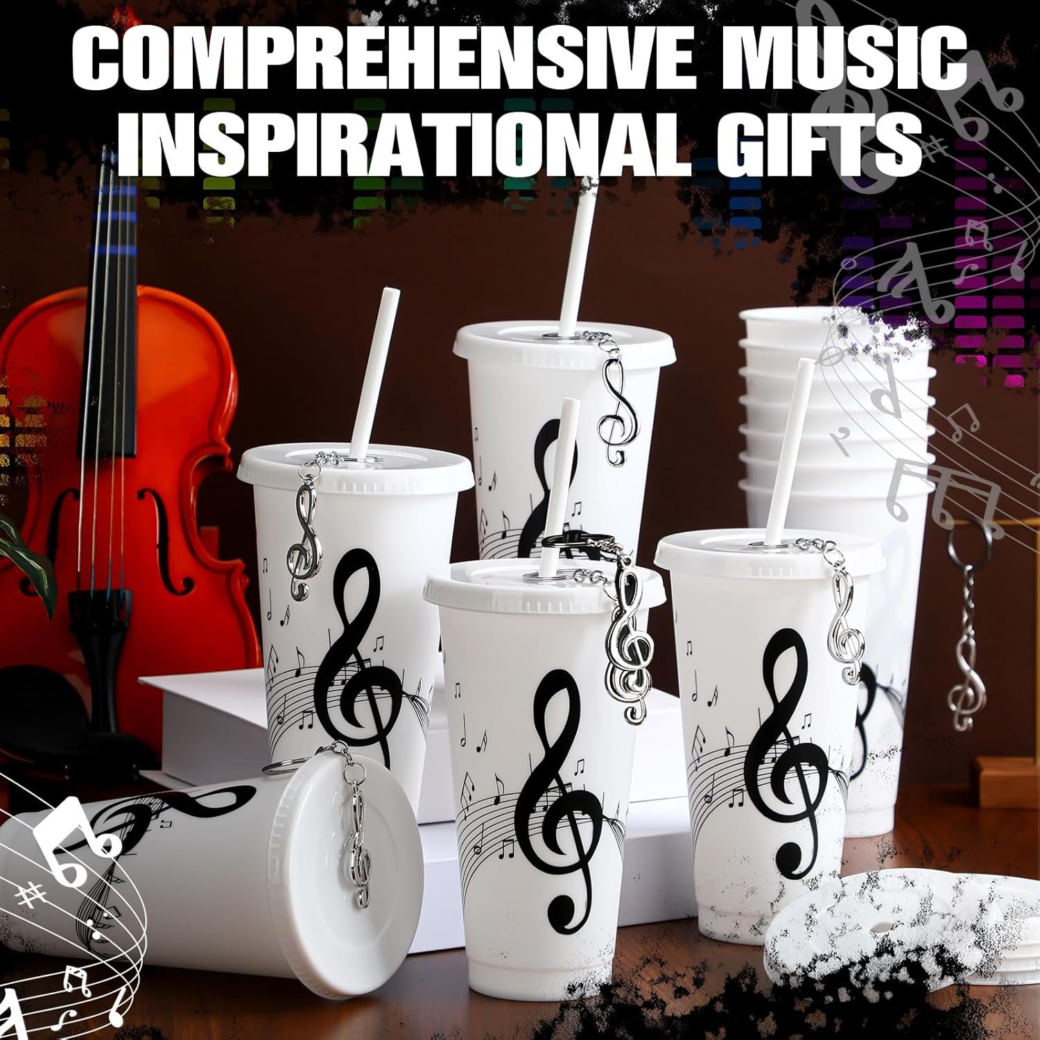 Skylety 12 Sets Music Themed Gifts Musical Note Tumbler Cups Bulk 24 oz Reusable Musical Note Plastic Tumbler with Straw and Lid Keychain Gifts for Music Lover Party Favor(White)
