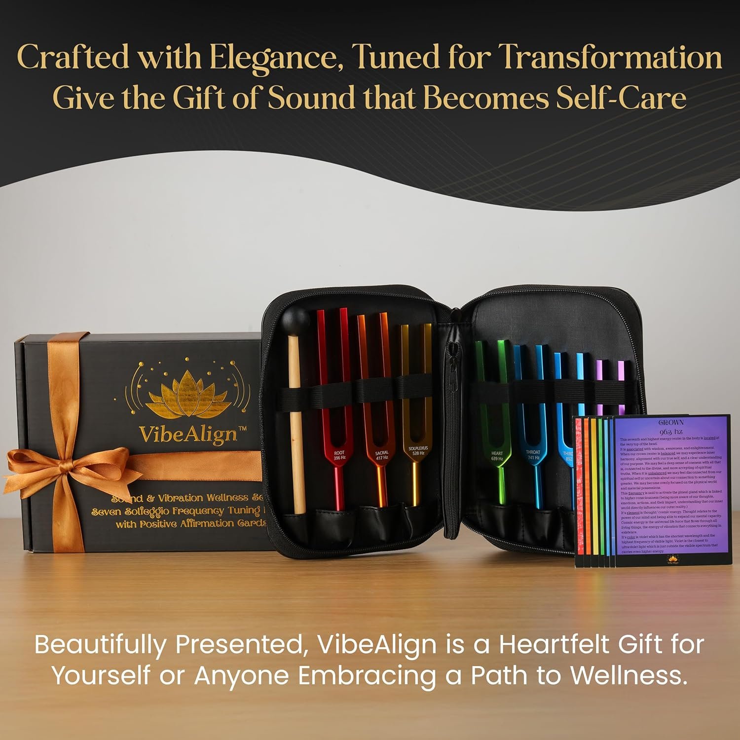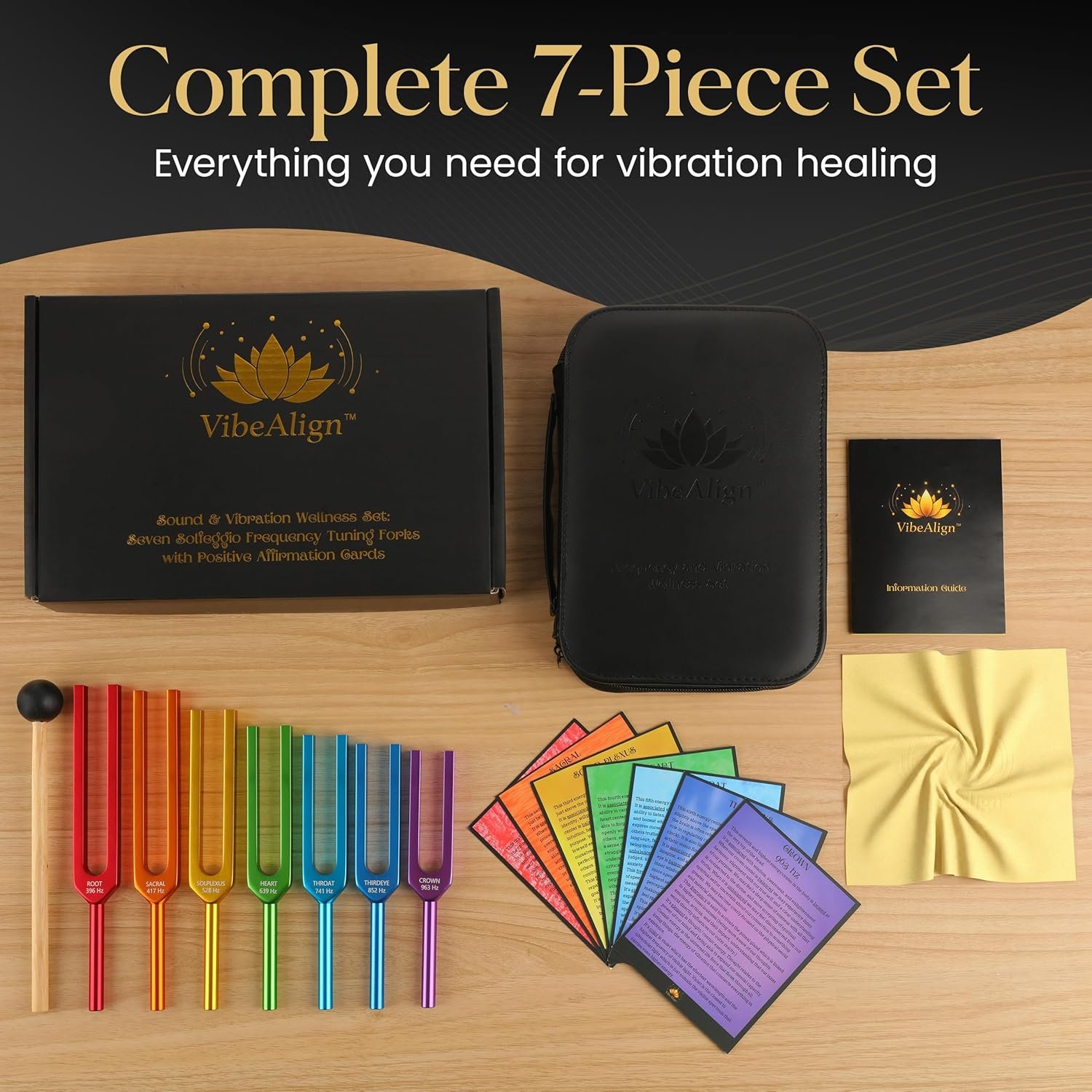 Tuning Forks Set with Positive Affirmation Cards for Vibration & Frequency Wellness- 7 Piece Solfeggio Frequency Color Coded Sound Instruments with Protective Case, Mallet, Cloth, and Guide.