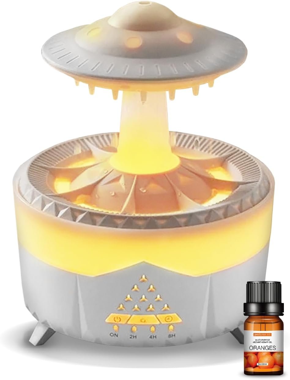 UFO Raindrop Humidifier Oil Diffuser – White – House Scent Essential Oil Desk Humidifier for Aromatherapy – Mushroom Desk Lamp Diffuser With Orange Aroma Oil Included