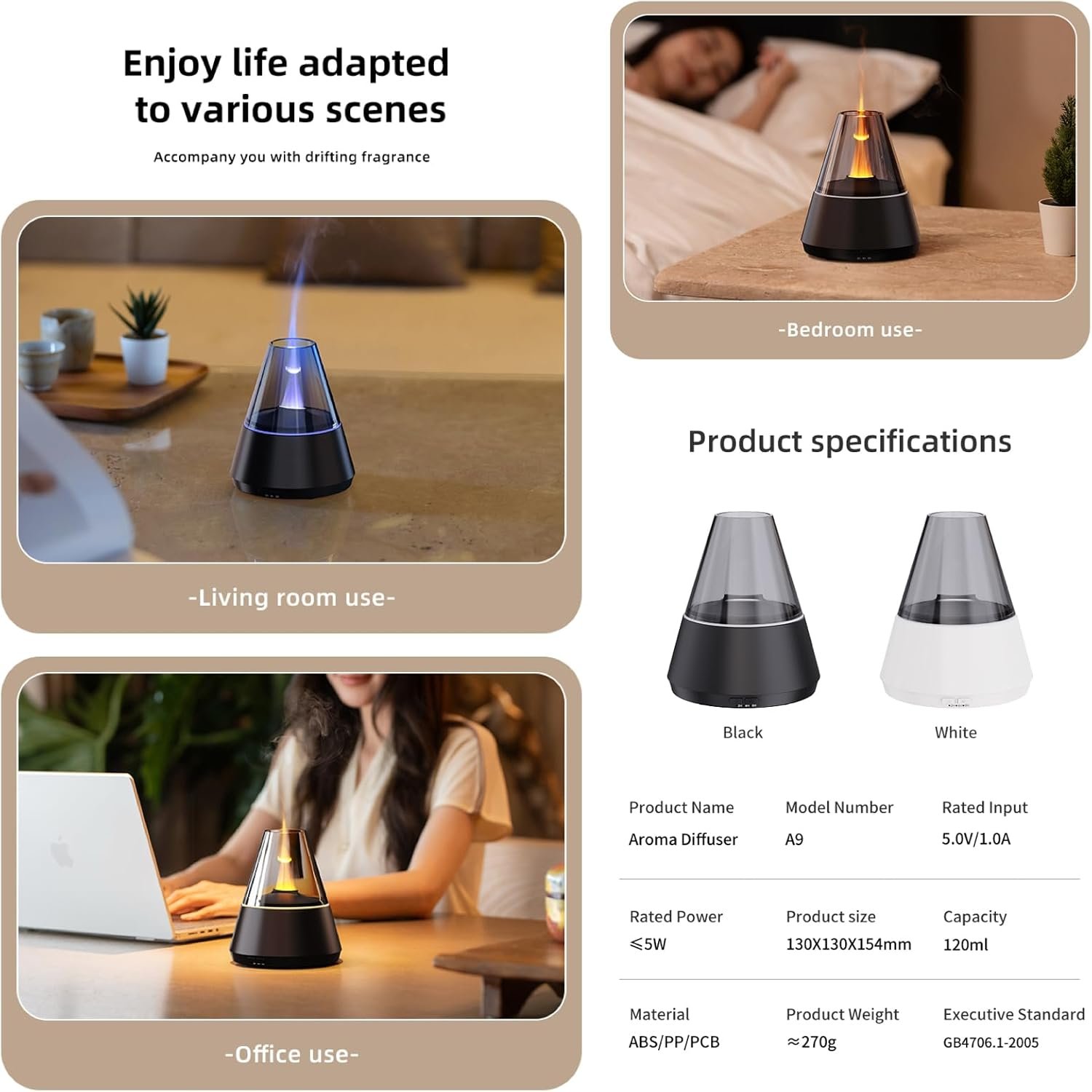 Ultrasonic Aroma Diffuser with Simulated Flame, 150ml, Timer and Auto-Off, LED Ambient Light (Black)