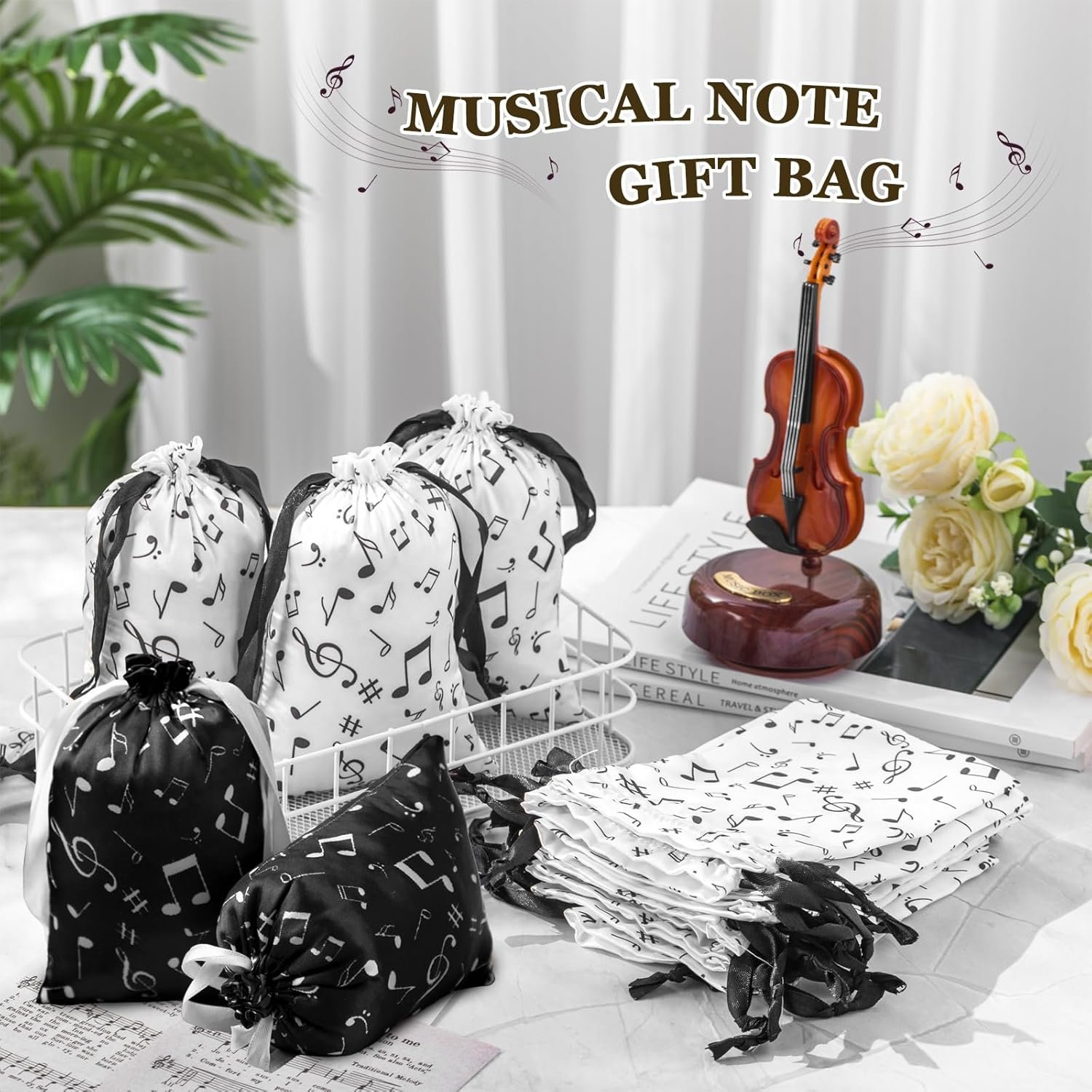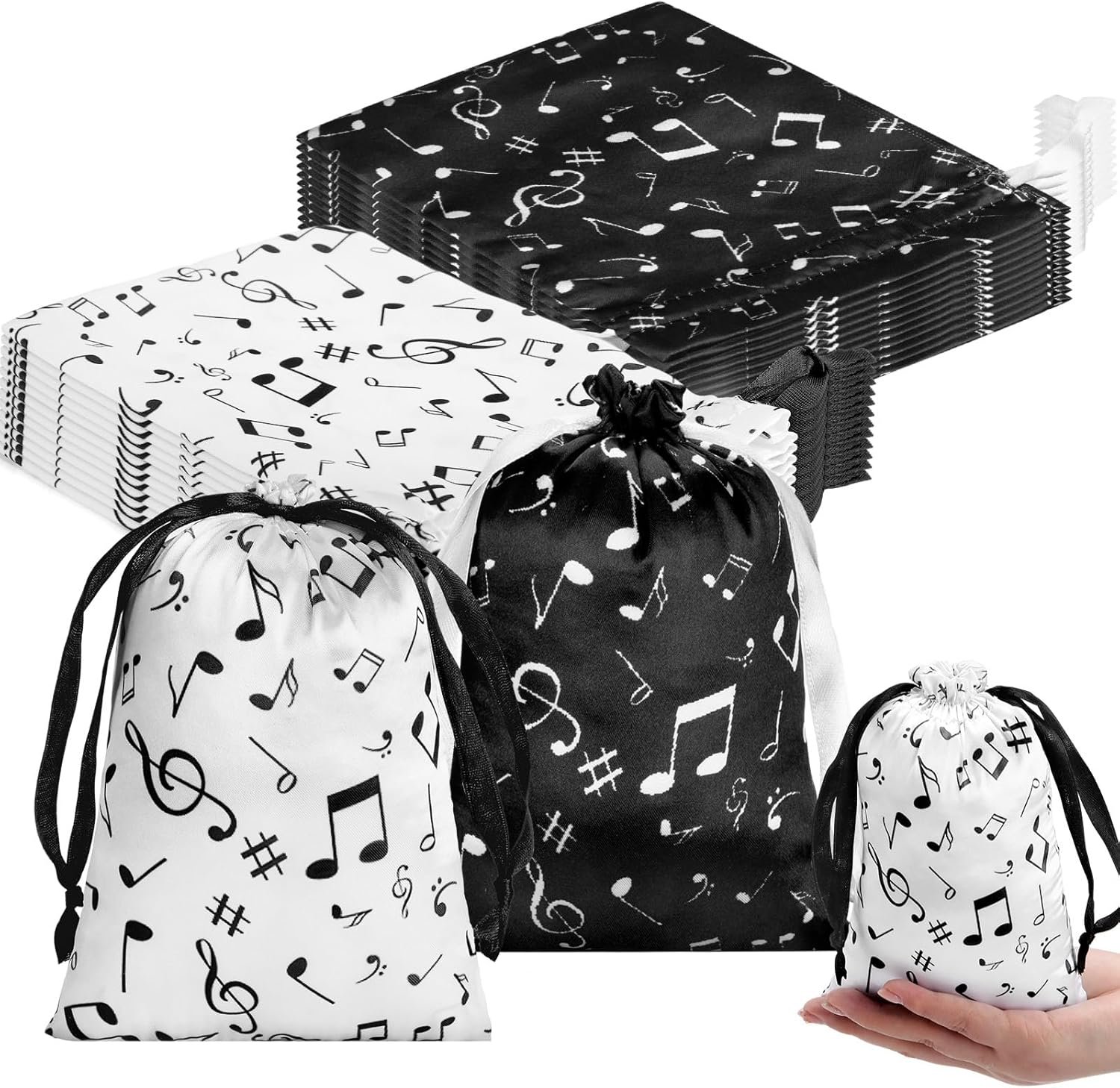 Wesnoy 24 Pcs Music Notes Gift Bags Musical Note Drawstring Treat Bag Music Decorations Party Favor for Musician Gifts Social Media Musical Party Supplies(5 x 7,Black, White)