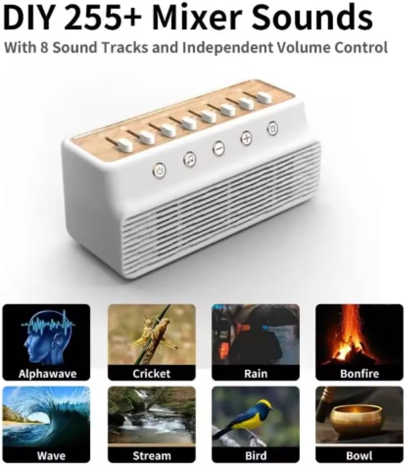 White Noise Machine with Portable Bluetooth 5.0 Speaker, 255+ Sound Mixer, Timer Function, Sleep Sound Machine, White/Wood Color. for Relaxation, Stress Relief, Wellness, Yoga, Deep Sleep, Focus.